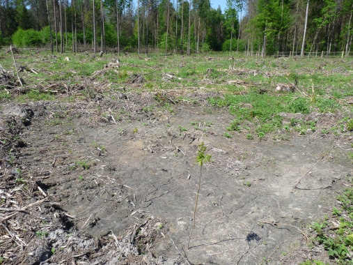 | Placówka z posadzonym dębem. Na tej samej powierzchni zastosowano orkę w pasy w różnych odstępach. Pomiędzy położonymi naprzemiennie blokami znajdzie się miejsce dla odnowienia naturalnego. Fot. J. Słowik |