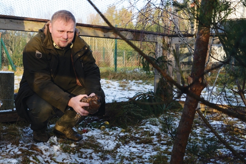 | Nadleśniczy Krzysztof Krasula uwalnia cieciorkę w wolierze hodowlanej |
