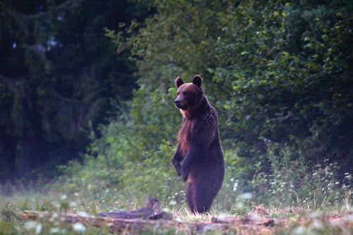 Niedźwiedź brunatny (Ursus arctos) – od czasu epokilodowcowej największy drapieżnik naszego kontynentu. Ciężar dorosłego samca (wwarunkach europejskich) dochodzi do 350 kg. Zwierzę jest tak silne, że złatwością jednym uderzeniem łapy może zabić krowę czy dużego knura. Bez truduodpędzi też wilczą watahę. Niedźwiedzie żyjące w Europie żywią się przedewszystkim pokarmem roślinnym, rozkopują też mrowiska, ale nie gardzą padliną ilubią zaglądać do pasiek. Samica co dwa lata rodzi młode (1–3), które pozostająprzy matce ok. 18 miesięcy.