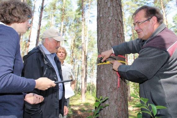 | Minister leśnictwa Brandenburgii Jörg Vogelsänger (z prawej) i prezes NABU Olaf Tschimpke (w środku) oznaczają drzewa badawcze w jednym z „laboratoriów na świeżym powietrzu”. Fot. www.moz.de/oliver schwers |
