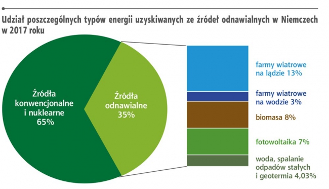 W pierwszym półroczu 2017 r. udział energii ze źródełodnawialnych w całości zapotrzebowania na prąd w Niemczech osiągnął po razpierwszy poziom 35%. Nasi zachodni sąsiedzi wykorzystali przede wszystkim siłęwiatru na lądzie (39,4 mld kWh), energię z biomasy (23,2 mld kWh) ifotowoltaikę (21,9 mld kWh). Niestety, za wzrostem produkcji energiiodnawialnej nie nadąża rozbudowa niemieckiej sieci energetycznej, którejstabilizacja wymaga ogromnych nakładów finansowych.