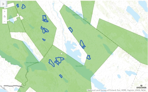 | Zaznaczone na niebiesko kontury oznaczają zatwierdzone powierzchnie manipulacyjne cięć w lasach państwowych regionu Västerbotten |