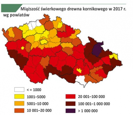W 2016 r. pozyskano w Czechach ok. 4 mln m3 świerkowegodrewna kornikowego, a w 2017 r. – blisko 6 mln m3. Prognoza na rok 2018 to10–12 mln m3. Do czasu obecnej klęski historycznie najwyższy poziom pozyskaniadrewna kornikowego w Czechach wynosił 2–3 mln m3.