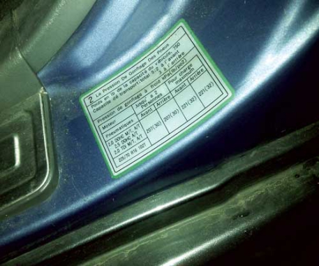 | Usytuowana na progu tabliczka informująca o zalecanym ciśnieniu w oponach Fot. S. Kołacz |