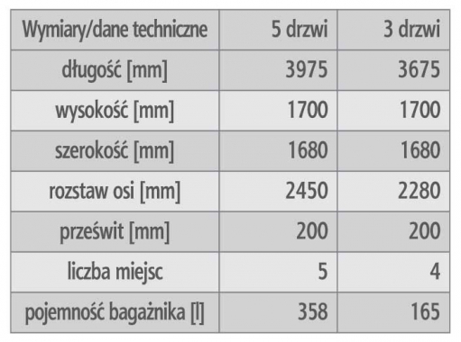 Zawieszenie jest konstrukcją trwałą, wynikato z zastosowania stosunkowo prostych rozwiązań. Dzięki niewielkim wymiarom imałemu promieniowi skrętu (4,9/5,2 m w zależności od wersji), autem łatwomanewruje się zarówno na leśnych drogach, jak i w zatłoczonym mieście. Układkierowniczy, wykorzystujący przekładnię zębatkową ze wspomaganiem, nie sprawiakłopotów.