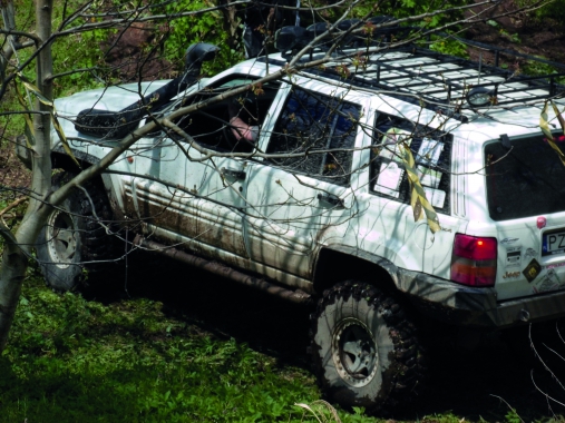 Sporym zaskoczeniem było startowanie w klasie„turystyk” aut „obutych” w opony 35” MT i wyposażonych nawet w dwie blokady. Nocóż, życie… Kolejne PP były zróżnicowane, część na stromych podjazdach, kilkabardzo łatwych, kilka w całkiem słusznych, „przełamanych” dziurach. Dodatkowo wjednym z miejsc kilka PP było usytuowanych w podmokłym terenie, do części znich trzeba było się dostać przez rów. Woleliśmy odpuścić, m.in. z powoduwystępowania w tym miejscu stempli innych klas, co skutecznie zagęściło zarówno teren, jak i atmosferę… Mając do wyboru „przeszkadzanie”innym i długotrwały pobyt w błocie, wybraliśmy dalszą fajną zabawę, nieulegając skokom ciśnienia. Jeep, dzięki wyższym i zdecydowanie bardziejterenowym oponom oraz wrodzonemu talentowi kierowcy, zaliczył kilka pieczątekwięcej od nas, raz jednak to nam udało się mu pomóc – fakt wyciągania Jeepa zbłotnej opresji był dla nas szczególnym powodem do dumy.