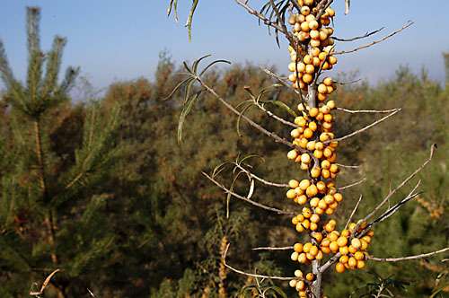 …a to już zrekultywowano. Rokitnik owocujący na tzw. zwałowisku zewnętrznym, gdzie składowany jest nadkład ziemny zdjęty znad pokładów węgla