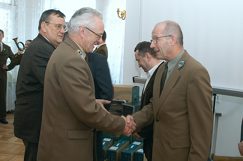 Gratulacje z rąk dyrektora Ryszarda Kapuścińskiego przyjmuje Eugeniusz Kowalik, nadleśniczy Nadleśnictwa Stary Sącz, zwycięzcy konkursu dla prenumeratorów „Lasu Polskiego”