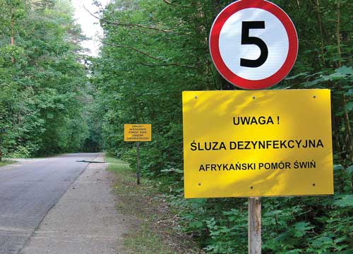 | Ostrzeżenia przed afrykańskim pomorem świń przy drodze Bielewicze – Wiejki w gminie Gródek Fot. www.pl.wikipedia.org/M. Grycuk |