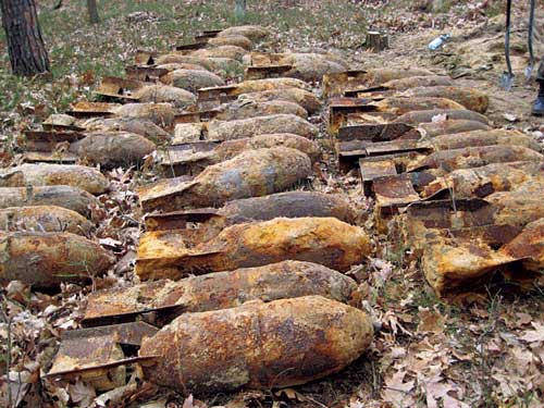 Przeczesując leśne ostępy, pirotechnikomudało się ujawnić i zabezpieczyć niewybuchy i niewypały – śmiercionośne pamiątki IIwojny światowej i poligonu, który funkcjonował tu przez wiele lat. Efektemakcji było wydobycie z ziemi, zabezpieczenie i przewóz do miejsca detonacjiponad sześciu ton bomb i innych materiałów niebezpiecznych. Szczegółowaspecyfikacja znaleziska zawierała m.in. 49 bomb lotniczych o wadze po 100 kgkażda, cztery bomby po 250 kg, dwa pociski moździerzowe, jeden granat ikilkadziesiąt sztuk amunicji.
