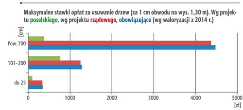Zmiana jest procedowana w trybienowelizacji ustawy o samorządzie gminnym oraz o zmianie niektórych innych ustaw– druk sejmowy 2656. Przy okazji tej nowelizacji dojdzie do zmiany wysokościopłat (i kar, które stanowią ich trzykrotność) za wycinkę. Dotychczas są onetak wysokie, że w wielu przypadkach samorządy nie są w stanie ich wyegzekwować.Bardzo istotna będzie konieczność wydania rozporządzenia, które zróżnicuje jezależnie od lokalizacji drzewa.