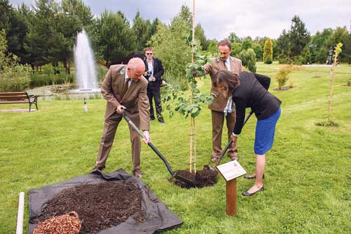 Ostatnia część uroczystości odbyła się w urokliwym ArboretumLBG. Anna Żornaczuk-Łuba, zastępca dyrektora Departamentu Leśnictwa i OchronyPrzyrody w Ministerstwie Środowiska, wraz z Januszem Zaleskim posadzili tampamiątkowe drzewko (na zdjęciu; towarzyszy im Czesław Kozioł). Podczasplenerowej części jubileuszu oprawę muzyczną zapewniła OrkiestraReprezentacyjna LP przy Technikum Leśnym w Tucholi.