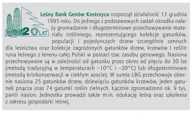 Leśny Bank Genów Kostrzyca (LBG) obchodził 24 czerwca jubileusz20-lecia działalności. Z tej okazji została przygotowana uroczystość, którarozpoczęła się mszą świętą w Miłkowie, celebrowaną m.in. przez byłego krajowegoduszpasterza leśników Edwarda Janiaka. Oprawę muzyczną uroczystej mszyzapewnili sygnaliści myśliwscy z Nadleśnictwa Złotoryja (RDLP we Wrocławiu).