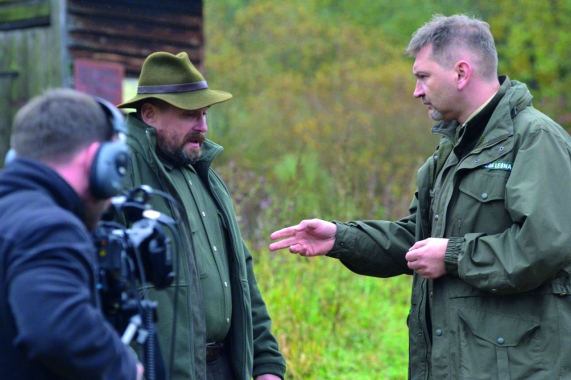Praca na planie filmu. Z lewej Paweł Grodziński, leśniczy leśnictwa Moszczaniec, wnuk kuriera Wojciecha Grodzińskiego.  Z prawej Maciej Szpiech z RDLP w Krośnie