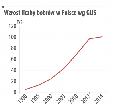 Rosną nie tylkoszkody, ale i sama populacja bobrów w kraju (patrz wykres). Wgocznikastatystycznego GUS („Ochrona środowiska 2015”) w Polsce w 2014 r. żyło 100216bobrów (stan na 31 grudnia). Największa populacja zamieszkuje woj. podlaskie(15 tys. osobników; drugie w kolejności jest woj. podkarpackie – 11,6 tys.szt.), najmniejsza – opolskie (400 szt.).