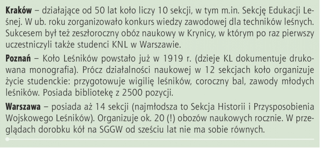 podejmowanych w ramach sekcji. Niekiedy bardzo pracochłonnych i wynikających zrzeczywistych problemów praktyki leśnej, jak np. analiza wpływu sposoburedukcji kory na dokładność pomiaru miąższości świerka. Albo realizowanych wporozumieniu z zainteresowanymi wynikami nadleśnictwami – warszawscy studencianalizowali wpływ użytkowania gałązek borówki na kondycję krzewinek. Studenckiebadania mają też nierzadko wieloletnią tradycję, jak choćby inwentaryzacjenietoperzy wykonywane w obiektach Międzyrzeckiego Rejonu Umocnionego (KL Poznań)czy inwentaryzacje ptaków leśnych w Lasach Sobiborskich (KNL Warszawa).