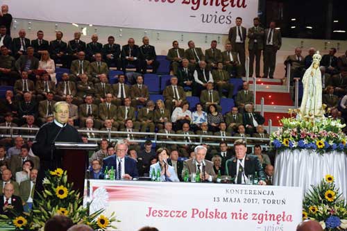 Konferencja „Jeszcze Polska nie zginęła – wieś” zgromadziła13 maja w grodzie Kopernika kilka tysięcy leśników i myśliwych (ze znacznąprzewagą tych pierwszych), przybyłych, jak to określił o. Tadeusz Rydzyk, nawezwanie ministra Szyszko. Toruńska hala Arena wypełniła się po brzegi, wobecczego podawana w mediach liczba 8 tys. uczestników wydaje się prawdopodobna.Jak zauważył prezydent miasta Michał Zaleski, drugą okazją tak dużej frekwencjijest spotkanie słuchaczy Radia Maryja.