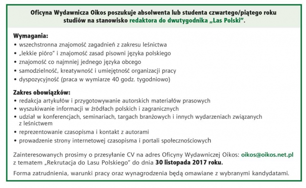 Poszukujemy redaktora do dwutygodnika „Las Polski”.